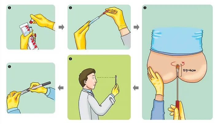 면봉을 직장에 넣은 후 검체를 채취하여 검사하게 됩니다.