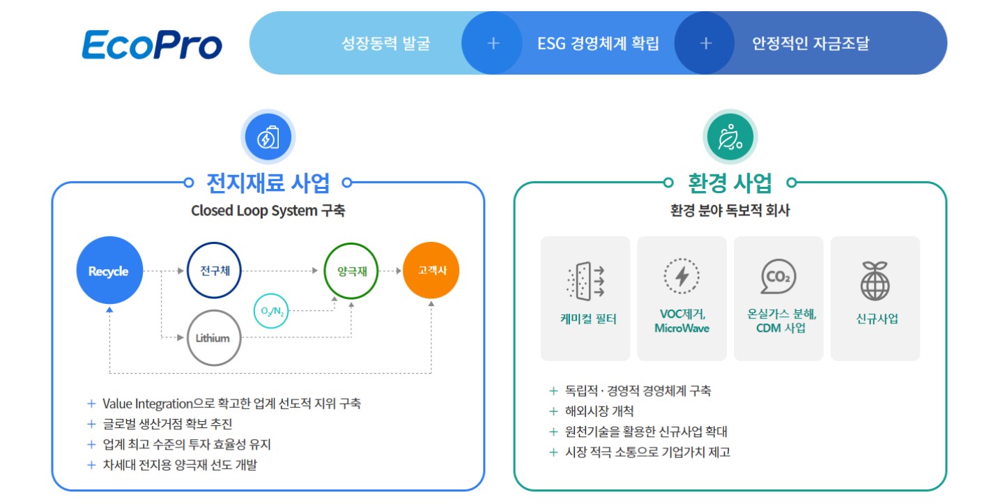 에코프로는 전지재료와 환경사업을 하는 기업입니다.