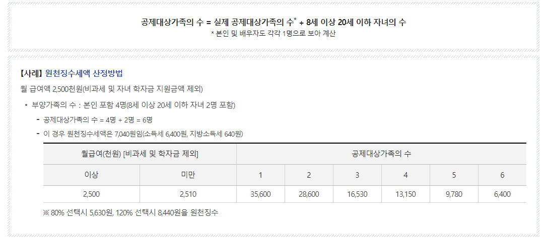 ex)  월급 106만원 + 부양가족 1인 = 소득세 1,040 원