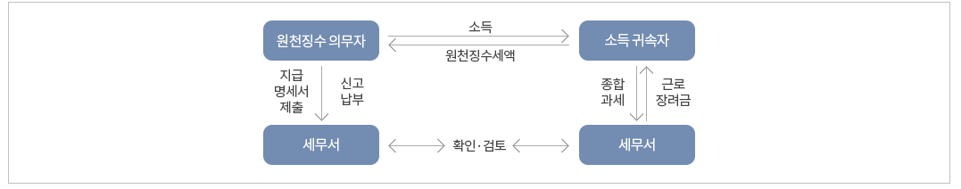 원천징수 - 해당 근로자의 원천세를 사업자가 근로자의 급여에서 먼저 제한 후 국가에 대납하는 제도