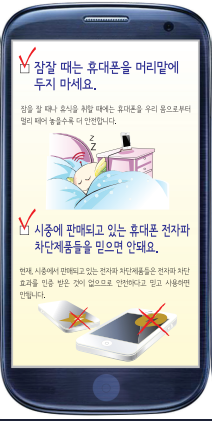 | - 얼굴에 직접 대고 통화하지 않고 스피커폰이나 블루투스, 이어폰을 이용 - 수신강도가 낮은 지역은 통신을 위해 전자파 세기가 커지므로 장시간 사용 피하기 - 음성통화보다 문자메세지 사용 - 통화시 좌, 우 얼굴을 교대로 접촉 - 성장기 어린이가 전자파에 더욱 민감하므로 가급적 휴대전화 이용 자제 |