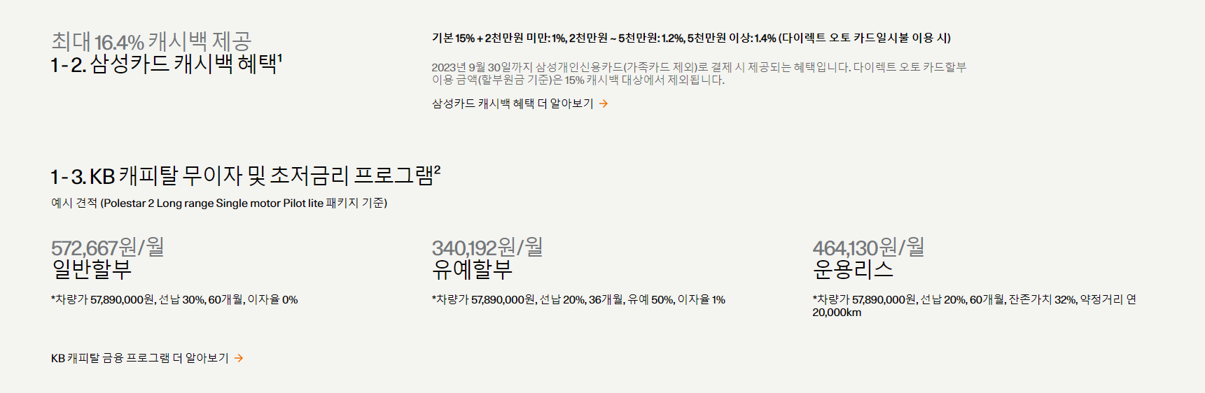 # 삼성카드 캐시백 행사와 KB 캐피탈 무이자 프로모션도 지원하고 있습니다.