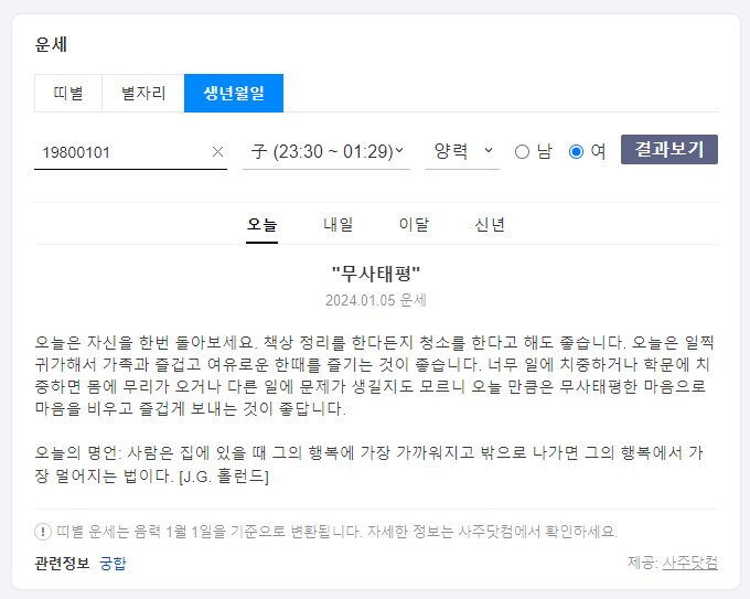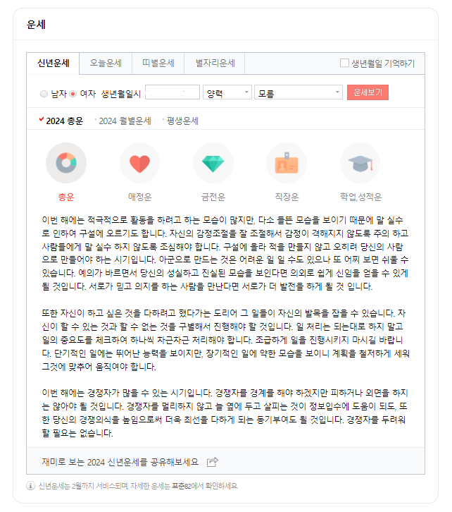 네이버와는 다르게 띠별운세나 별자리운세, 생년월일 운세만 제공됩니다.