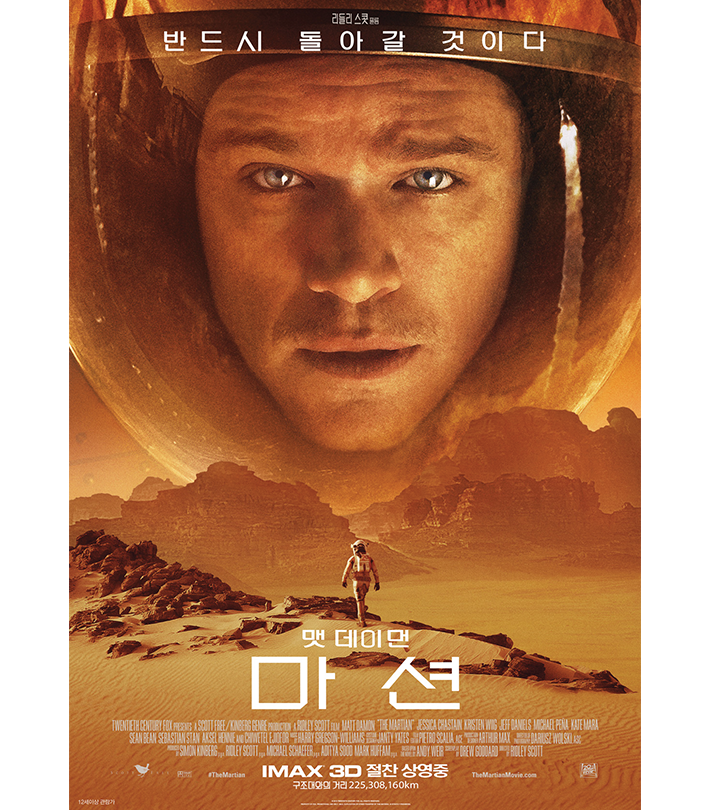 2015년 개봉한 영화 마션은 리들리 스콧 감독이 제작하였고 맷 데이먼 주연에 제시카 채스테인, 세바스찬 스탠, 제프 다이엘스 등의 배우들이 출연합니다. 144분짜리 영화로 개봉 당시 한국 관객 수가 무려 488만명으로 큰 인기를 끌었습니다.